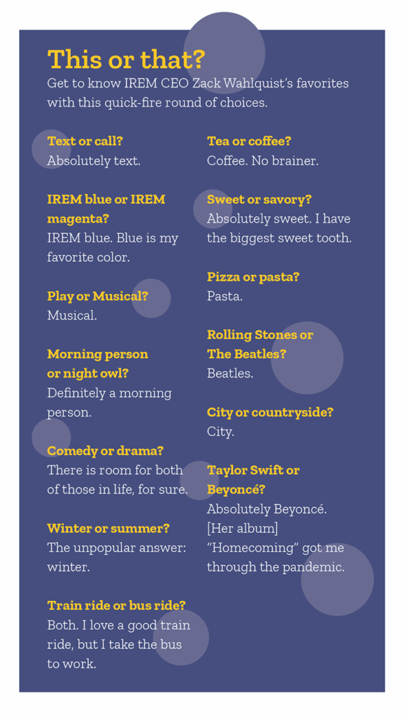 Early in 2025, Zack Wahlquist, FASAE, CAE, RCE, became the new CEO and Executive Vice President of IREM. He shares a bit about his career journey and his leadership philosophy.